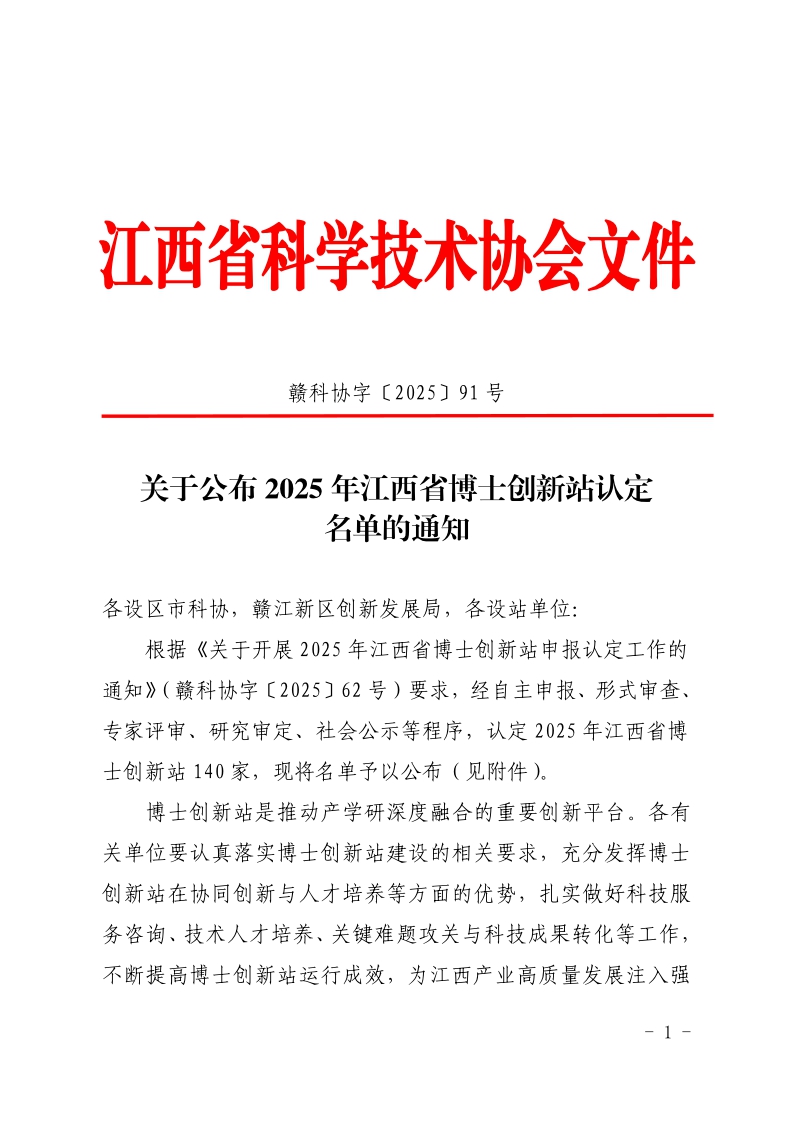 热烈祝贺公司获得2025年江西省博士创新站认定